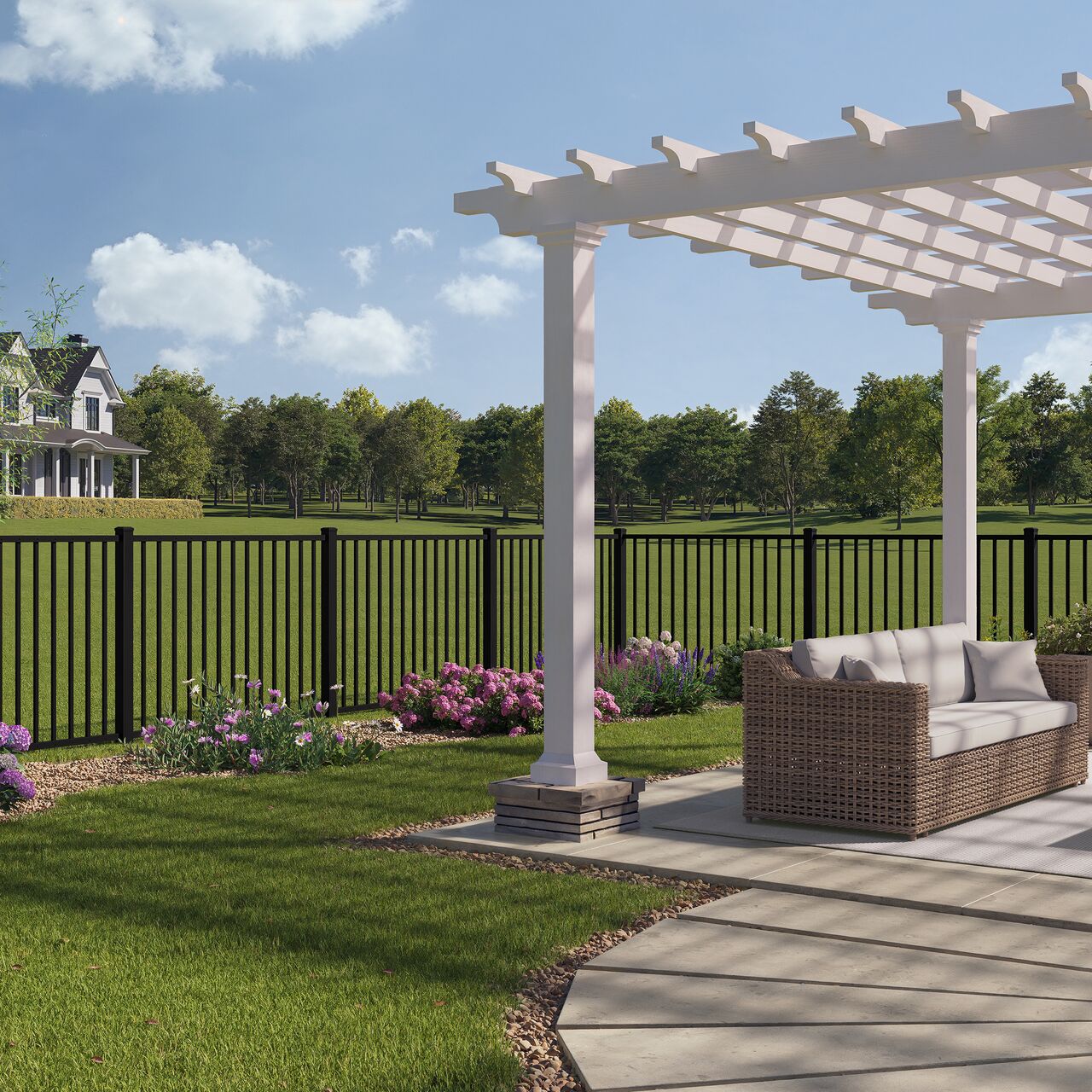 Whether in the front or back of your home, boost both security and aesthetics with a modern, airy picket profile that creates a neutral backdrop for flowering shrubs and leafy evergreens.
